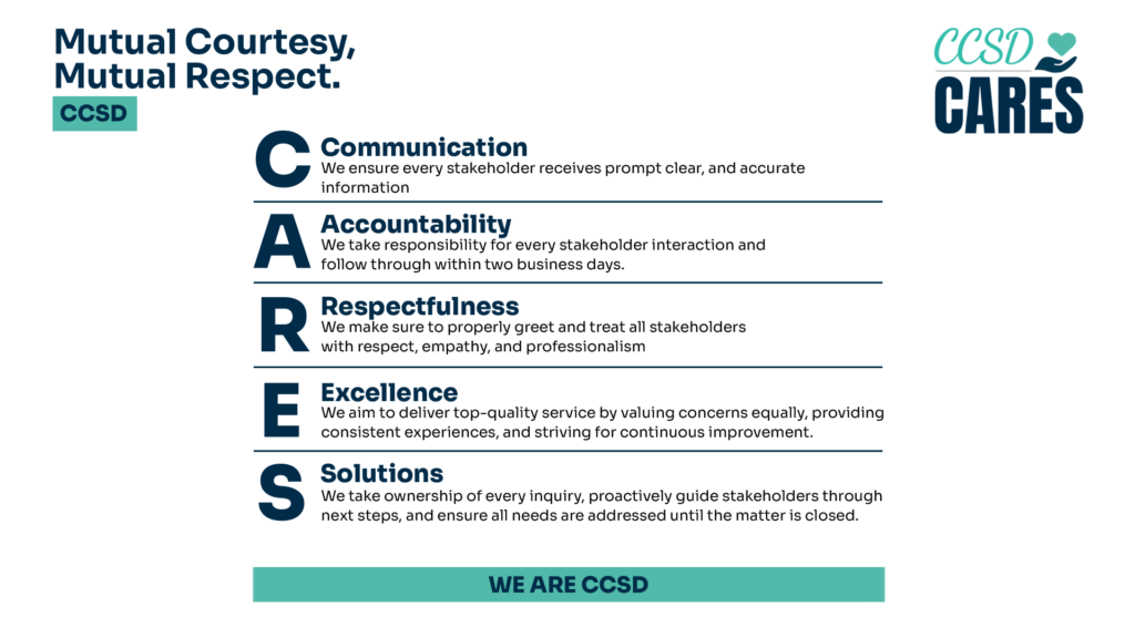 The program is now tied to five CCSD CARES Standards including: Communication, Accountability, Respectfulness, Excellence, and Solutions. When identifying an individual to nominate, be sure to select the Standard that is most exemplified by the recipient.