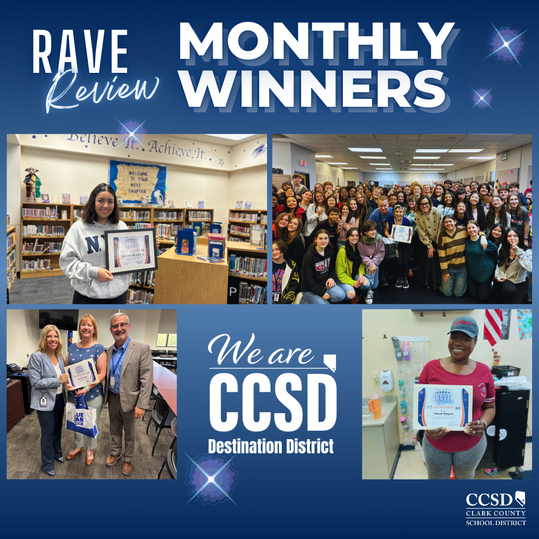 The RAVE (Recognize A Valued Employee) Review Program incorporates unsolicited acknowledgement of Clark County School District (CCSD) employees who make a difference and are exemplary models of the District’s Standards. Submissions should highlight accomplishments that exceed general job expectations and focus on those who truly go above and beyond for students, parents/guardians, fellow staff members, and the community.
